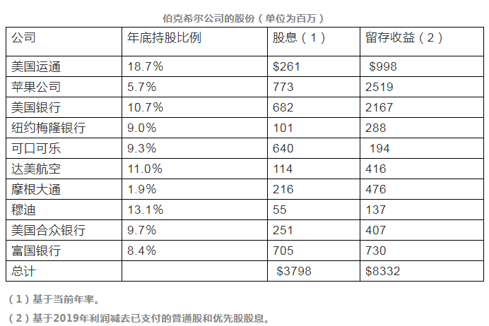 在此封致股东的信中,巴菲特还提到其他四个要点,分别是:一、关注营业收入。二、股票的力量是长期的。三、现金储备高企仍谨慎。四、继任计划。股东信的数据显示,截至2019年12月31日,伯克希尔哈撒韦合计持有市值为2480.27亿美元的股票,购入成本为1103.4亿美元,账面盈利1376.87亿美元。伯克希尔哈撒韦的十大重仓股依次为苹果、美国银行、可口可乐、美国运通、富国银行、美国合众银行、摩根大通、穆迪、达美航空和纽约银行梅隆公司。