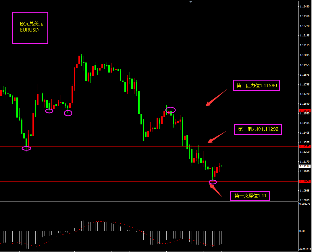 技术点评:天图欧元昨日收大阴线,因美国数据小非农大幅利好美元,美元走强对欧元形成打压,但MACD位于0轴之上,多头仍在,美指面临回落,日内欧元更多以震荡以及震荡上行为主。小时图欧元昨日以连续阴线下跌,空头一度强势,下方整数关口1.11位置未被大阴线打破,日内随着美指回落欧元将出现反弹?