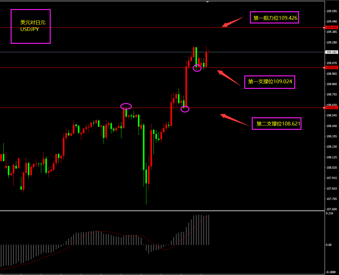 技术点评:天图美日昨日以大阳线收盘,留下长下影线,底部买盘较大,正如昨日所说,日元长期走贬值之路,下行逐渐承压,避险退潮之后,美日重回上涨走势。小时图美日底部形成“V”字形反转,MACD重回0轴之上,建立起多头为主,日内更多以震荡以及震荡上行为主。