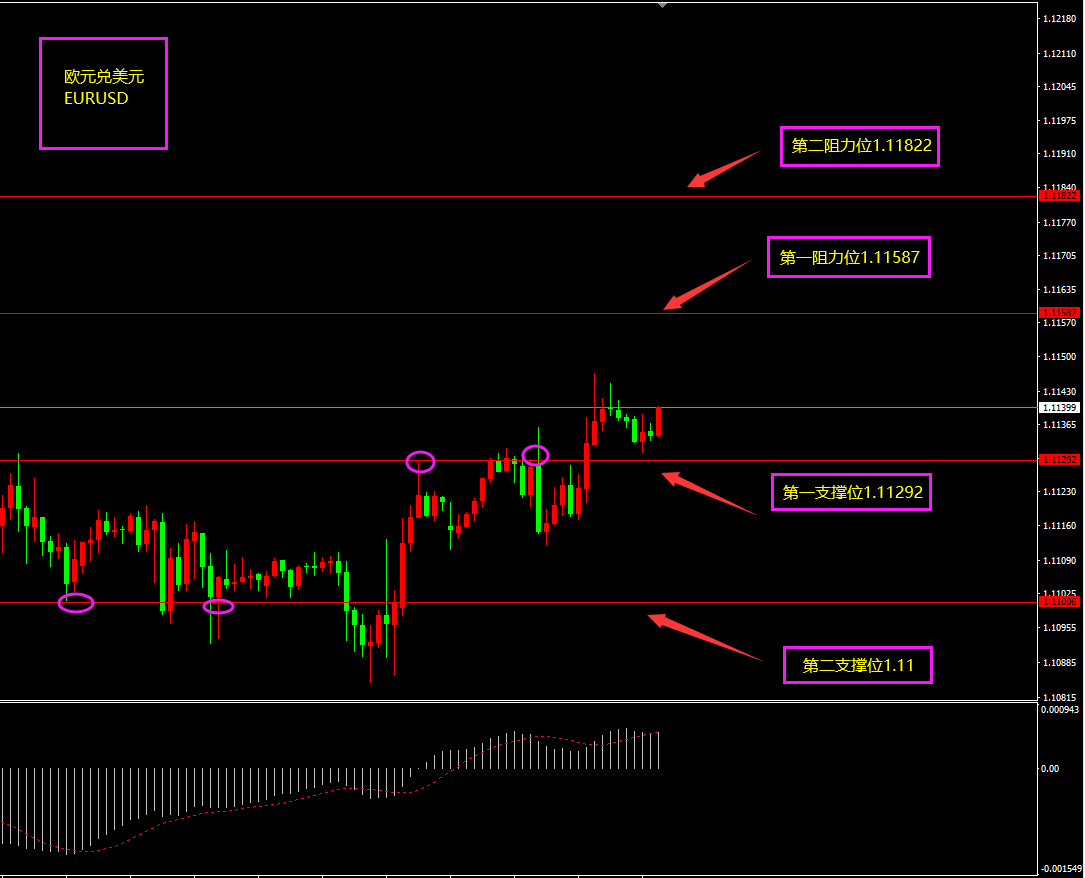 技术点评:天图欧元MACD位于0轴之上,多头为主,短期连续三日收阳线,多头开始发力,日内继续保持以逢低看多为主。小时图欧元自MACD形成底背离之后,期间有连续大阳线拉,MACD转移0轴之上,多头为主,底部1.11位置将是下方强力支撑,日内更多选择逢低看多为主。