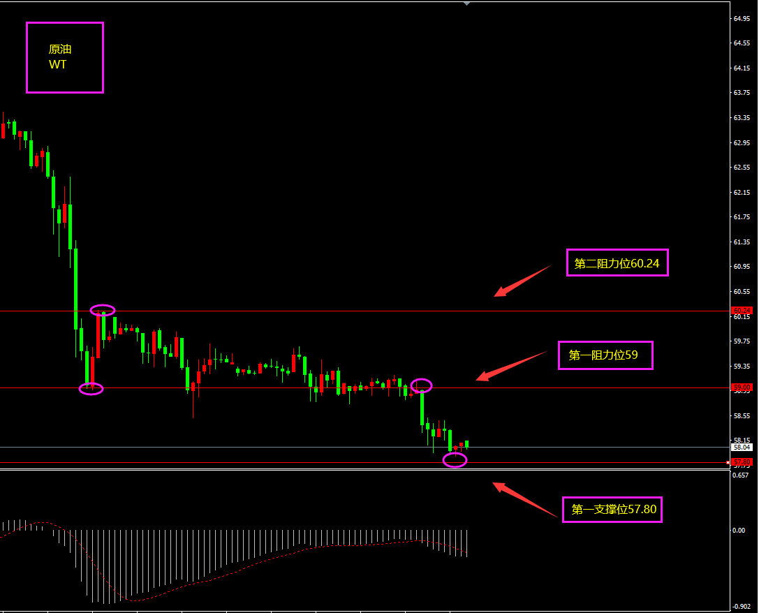 技术点评:天图原油6连阴,避险潮退以及库存增多促使油价近几日出现连续下跌,但需注意连续走弱后将出现一波小幅反弹,关注底部是否有阳线产生,阳线出,反弹起。小时图原油以大阴线跌破59整数关口,MACD也转移至0轴之下,空头为主,但需注意底部形成了底背离,存在超跌反弹这种情况。日内做空需谨慎。