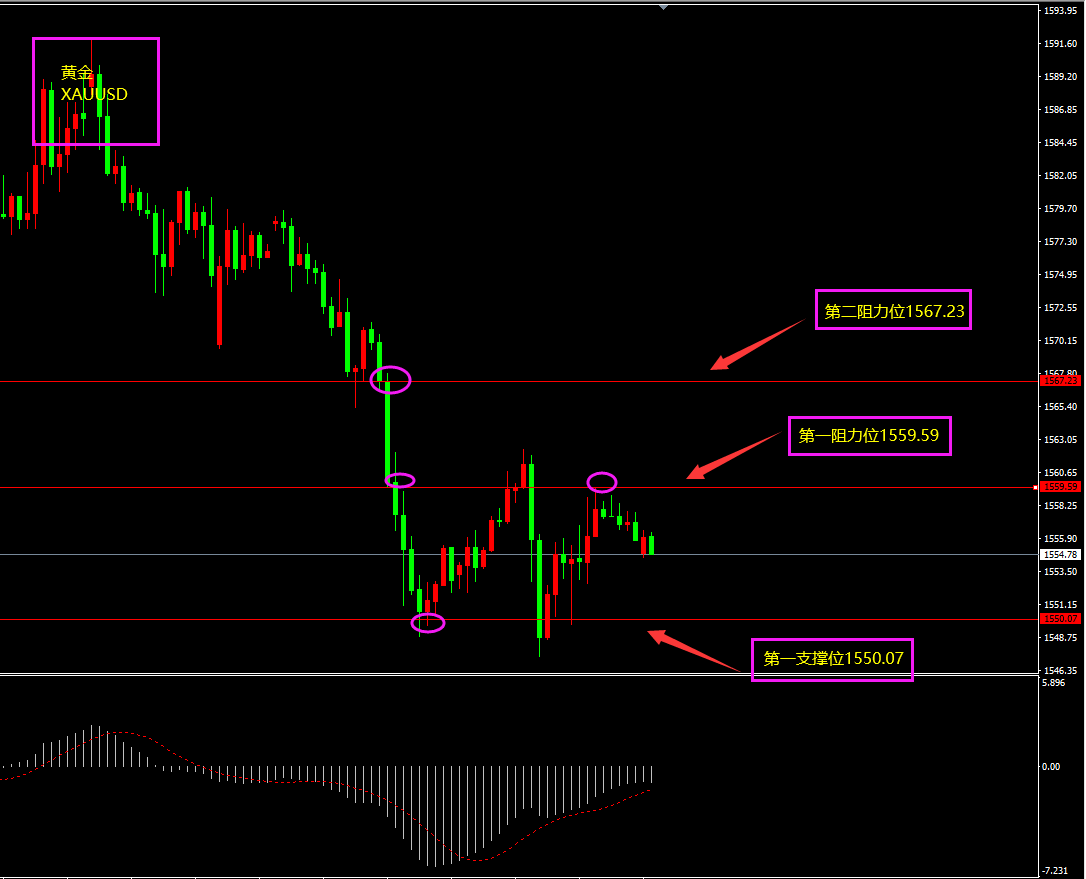 技术点评:天图黄金处在下降回调走势之中,昨日美指强势,黄金意外走强,日内美指高位或将对黄金构成支撑,黄金日内继续以逢低看多为主。小时图黄金期间大阴线下跌,亦有连续阳线拉升,底部1550未形成有效跌破,支撑仍在,MACD逐渐上移,日内继续以逢低看多为主。