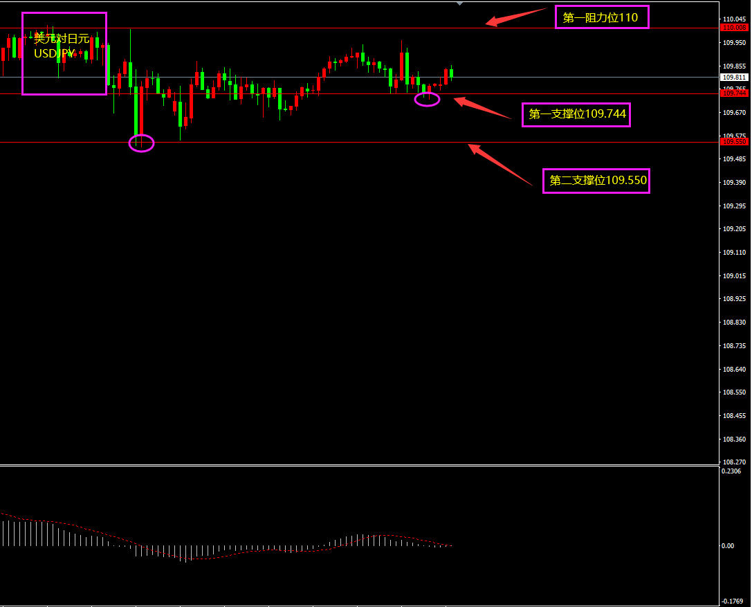 技术点评:天图欧元结束6连阴,昨日底部收小阳线,暗示底部多头入场,但底部多头力度相对较弱,日内实体部分若不在创新低,则将形成一波反弹。小时图欧元MACD再次在底部形成底背离,期间长下影线之后有大阳线拉升,行情逐渐反转,日内保持以逢低看多为主。