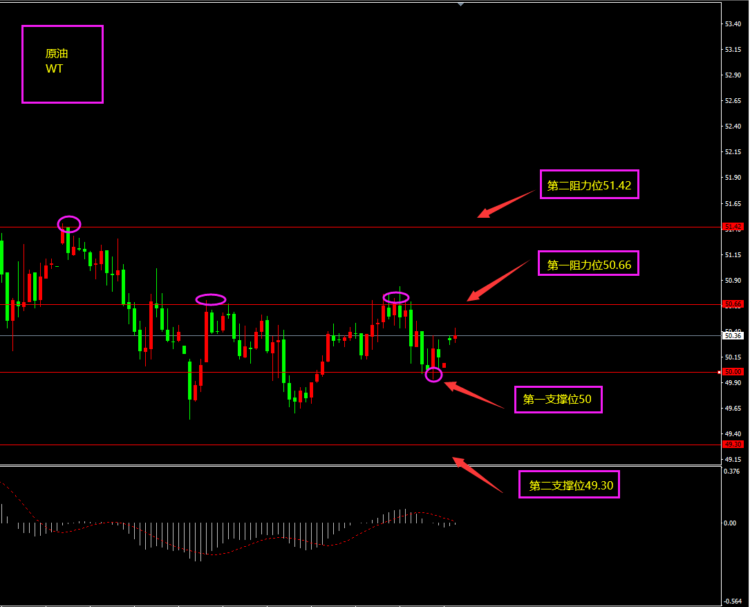 技术点评:天图原油从65跌至50,跌幅较大,底部目前大阳线开盘价未破,多头买单依然存在。随着近期市场的回暖,需求量将会上升,油价会慢慢上涨,未来看向55?小时图原油期间冲高之后有所回落,因API库存增多,对原油形成打压,但原油近期底部买盘越来较大,底部大阳线明显强势,日内以逢低看多更为有效。