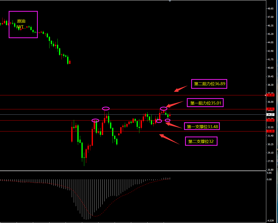 策略分析:第一、二阻力位轻仓附近看空。如有大阳线突破第二阻力位则转为观望。