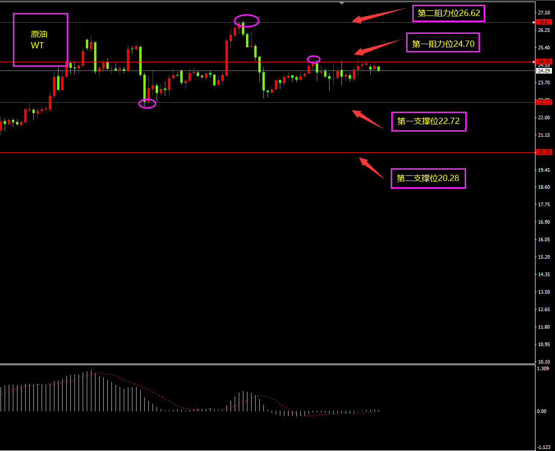 策略分析:第一、二支撑位附近轻仓看多,如有大阴线跌破第二支撑则转为观望。