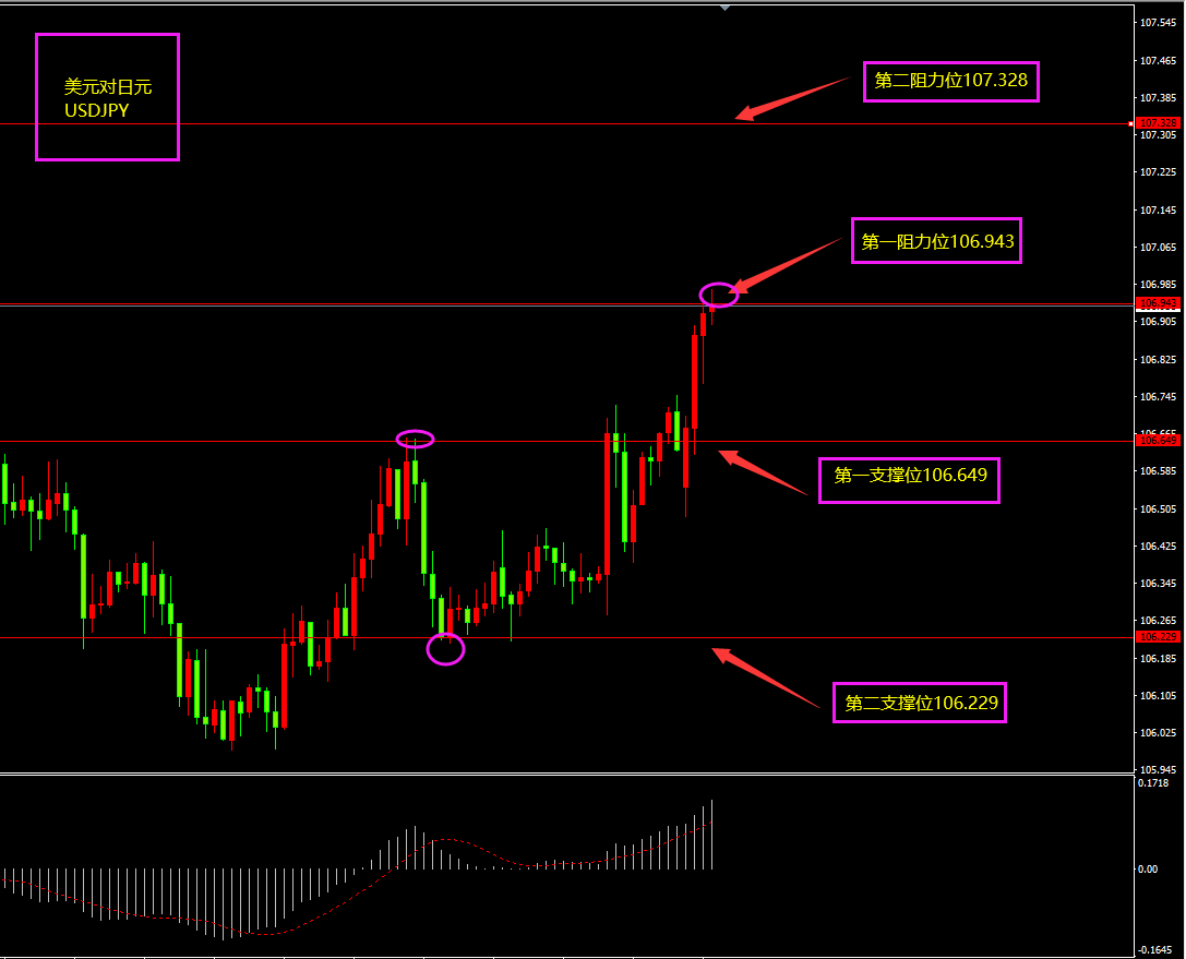 技术点评:天图美日近几日有所上扬,因价格接近下方大阳线开盘价,受到支撑,短期日元避险属性有所下降,促使日元回吐,带动美日短期上行,日内更多偏震荡为主。小时图美日期间有连续大阳线拉升,MACD位于0轴之上,多头占优,日内更多以逢低看多为主。(存在大幅回落风险)