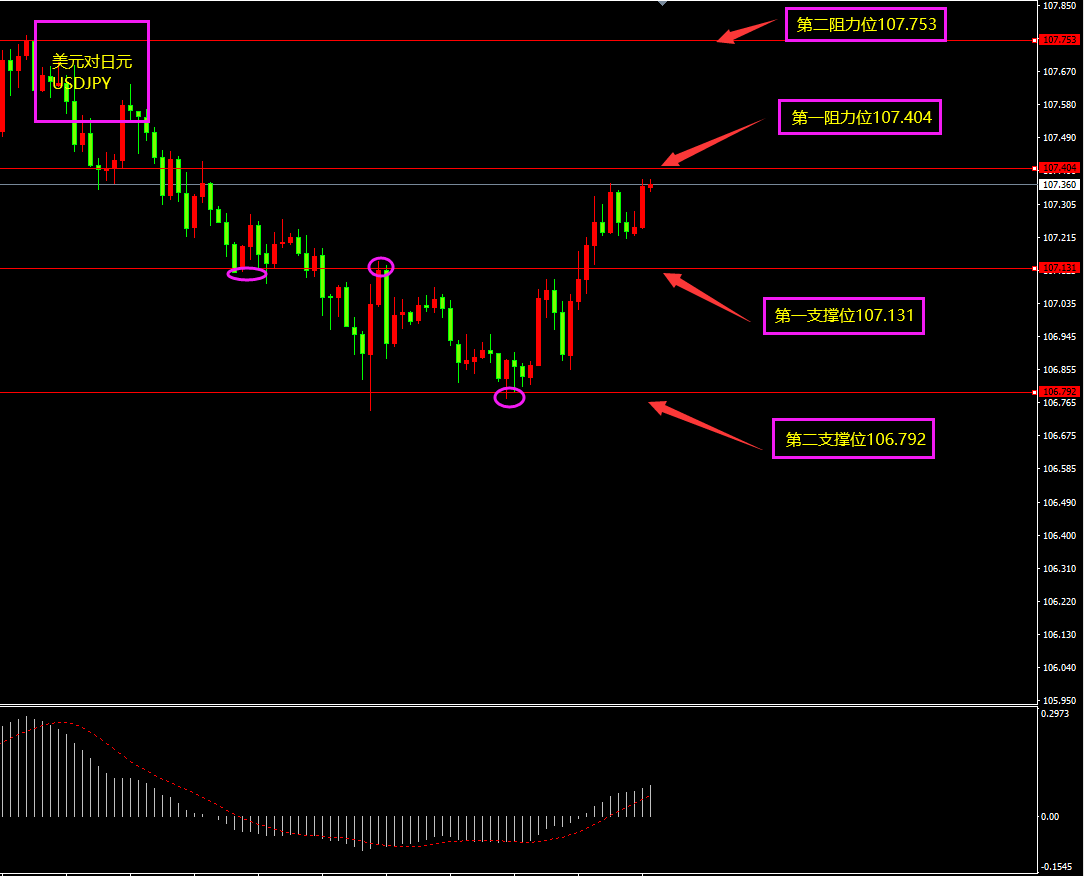 技术点评:天图美日昨日收阳线,自前日下影线较长,底部空头有所减弱,多头有所增强,短期MACD仍位于0轴之下,空头仍在,日内更多以震荡为主。小时图美日期间有连续阳线拉升,MACD位于0轴之上,多头小幅占优,但日内需注意美指的回落带动美日下行,日内更多以偏震荡为主。
