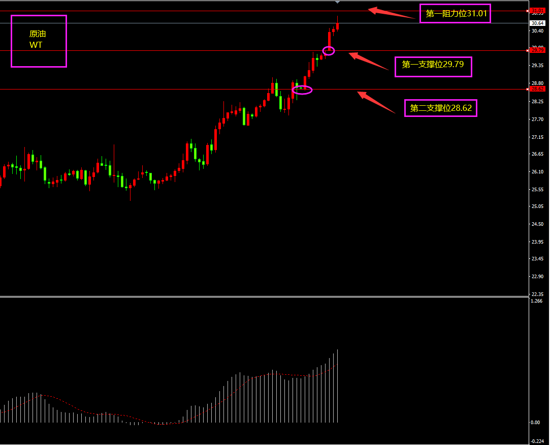策略分析:第一、二支撑位附近轻仓看多,如有大阴线跌破第二支撑则转为观望。