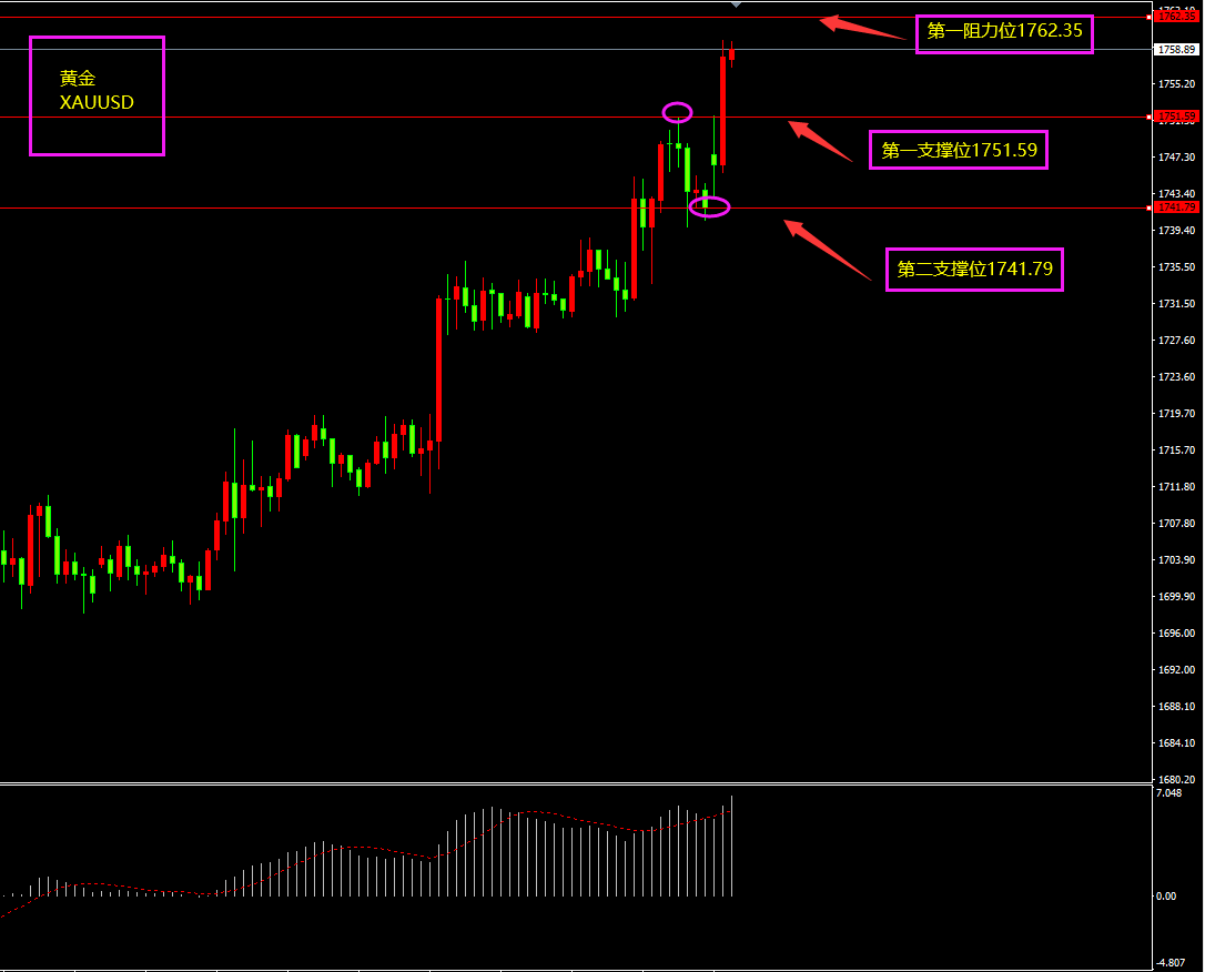 技术点评:原油天图自底部形成底背离之后,后续有大阳线产生,多头为主,前期小幅回调,回调之后重回上涨走势,日内应顺应方向逢低看多为主。小时图原油连续以大阳线突破创新高,MACD位于0轴之上,多头为主,日内以逢低看多为主。期间大阴线不出,空单不入。