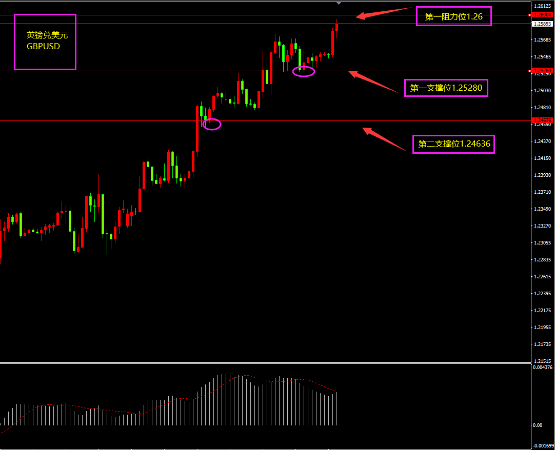 技术点评:天图欧元6连阳,MACD位于0轴之上,多头为主,短期因美指表现较弱而出现大幅度上涨,美指不强,欧元不弱,但需注意连续上涨之后面临回调风险,日内以震荡为主。小时图欧元价格再创新高,期间虽形成顶背离,但以极强的方式继续上涨,日内大阴线不出,空单不入?