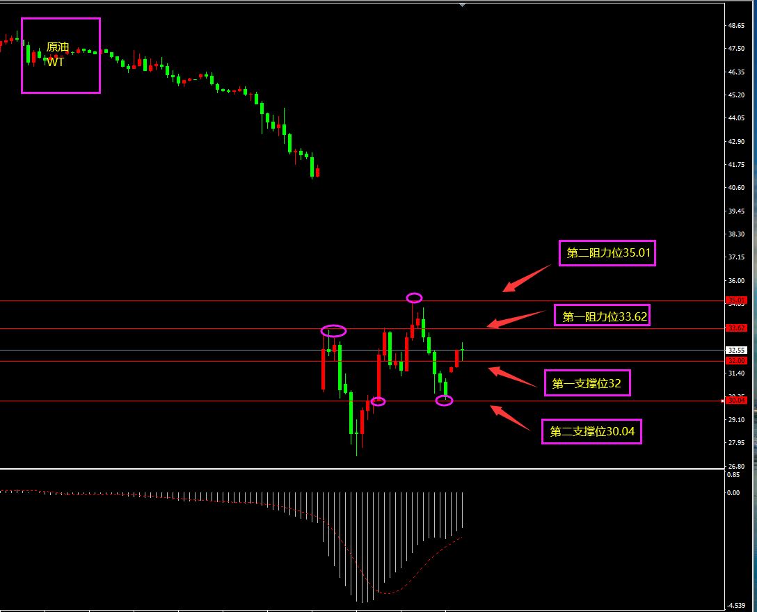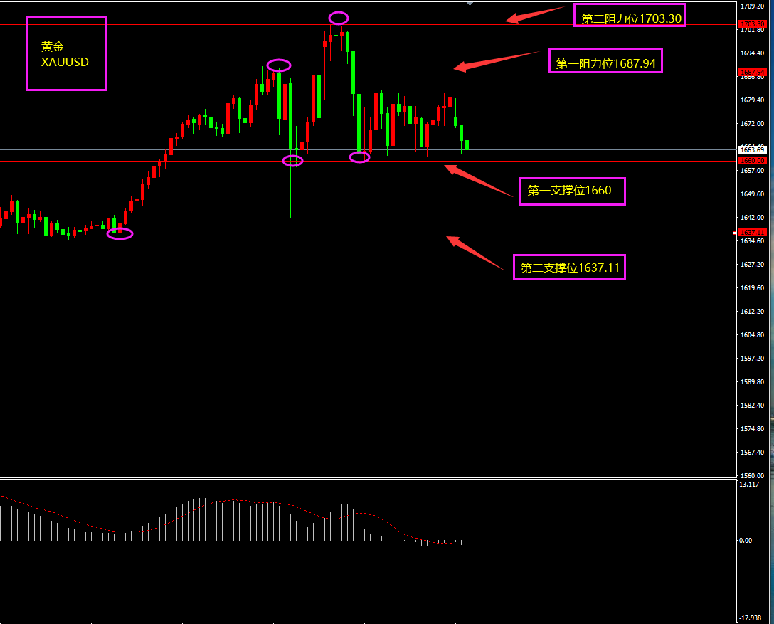 策略分析:第一、二支撑位附近轻仓看多。如有大阴线跌破第一支撑位则转为观望。